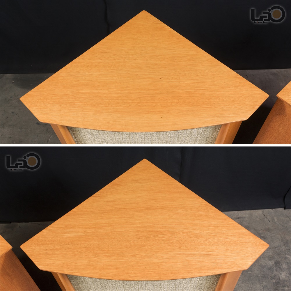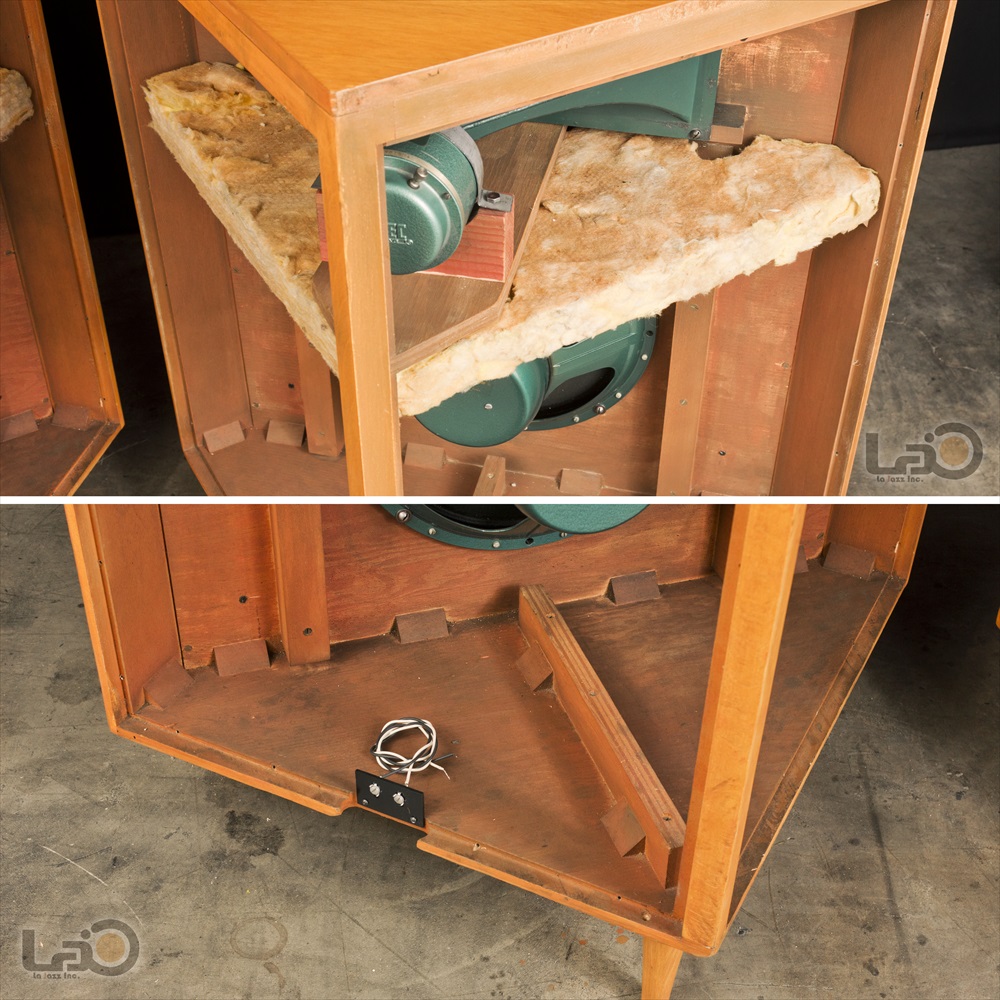 本品は1959年にALTEC社から発売された2way2スピーカーシステム、832A CORONAです。劇場スピーカーを得意とするALTEC社の「サウンド・オブ・シアター」シリーズをオーディオ・ファンの要望に基づき家庭用に改小型化改良し発売したものです。コロナはALTECの中型システムのなかでも歴史ある最高級スピーカーシステムの一角。同社の「830A ラグーナ」「831A キャピストラノ」と同時に発売され、「ラグーナ」を一回りコンパクトにしたコーナースピーカーになります。